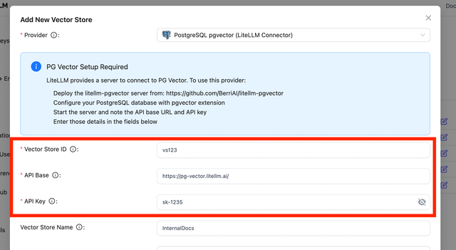 LiteLLM provides a server that exposes OpenAI-compatible vector_store endpoints for PG Vector. The LiteLLM Proxy server connects to your deployed service and uses it as a vector store when querying.